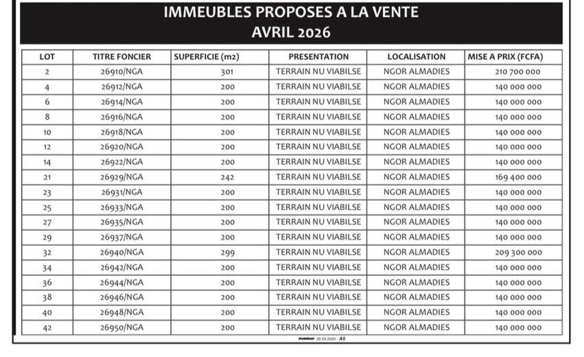 La Société Nationale de Recouvrement (SNR) informe le public du lancement d’un appel à soumissions cachetées en vue de la cession de plusieurs titres fonciers situés dans la zone prisée de Ngor Almadies à Dakar.